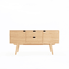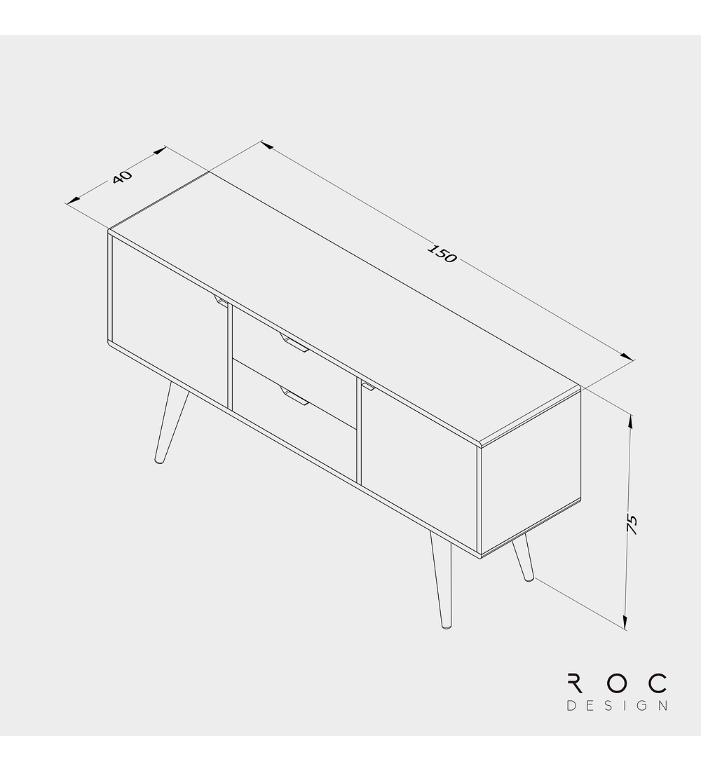 Rack estilo nórdico fabricado a mano. Mueble funcional, dispone de 2 cajones y dos puertas que abren hacia los lados. Fabricado en madera maciza de pino natural sellado y lacado Milesi de fácil limpieza y larga duración. Patas torneadas a mano y correderas de alto tráfico.
