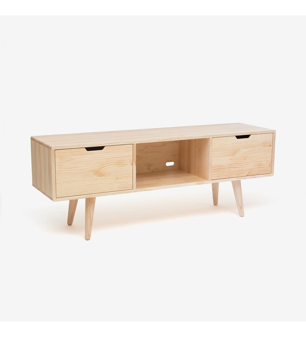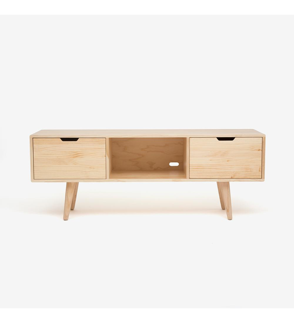 Rack estilo nórdico fabricado a mano. Mueble funcional, el cual dispone de 2 puertas que se abaten hacia abajo. Fabricado en madera maciza de pino natural sellado y lacado Milesi de fácil limpieza y larga duración. Patas torneadas a mano y correderas de alto tráfico.
