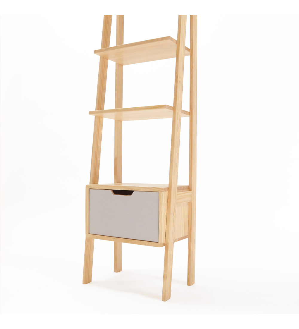 Repisa escalera fabricada y ensamblada a mano. Dispone de un cajón en su parte inferior y 4 repisas en su parte superior. Ideal para organización y/o exhibición en living, salas de estar, terrazas, dormitorios, etc generando amplitud en cada espacio.